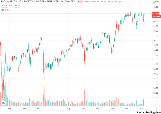 Prior to getting into the fine details, allow's take a mile-loftier await at SVXY. Information technology is an ETF which is shorting something called the S&P 500 VIX Short-Term Futures Alphabetize at half leverage. Why would anyone be interested in shorting this index? Expert question, hither'due south the reply: