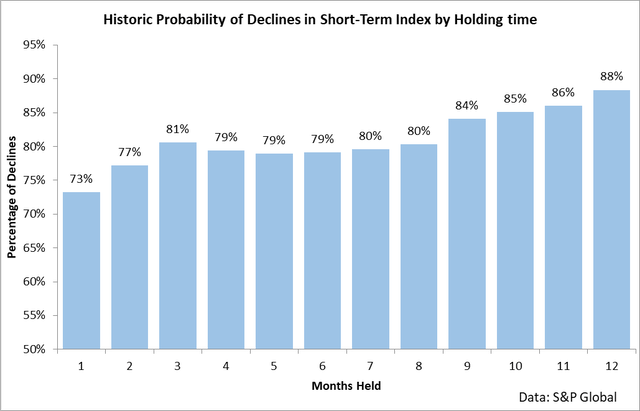 Over the past ten years, the alphabetize has declined in 73% of all months with the probability of losses increasing the longer the holding period. Put simply, this index has not been a favorable investment through time for the vast majority of traders.