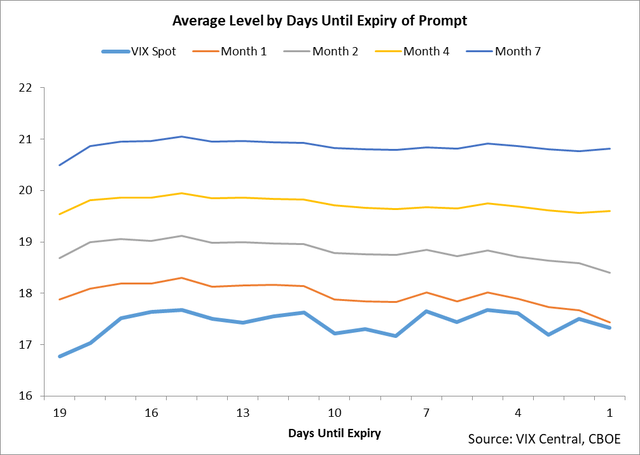 In the above chart, I have calculated the boilerplate level of the VIX besides as a few different futures contracts grouped past the days until expiry of whatsoever given month. This chart shows the typical lifecycle of VIX futures contracts during a month. The following relationships are conspicuously seen: