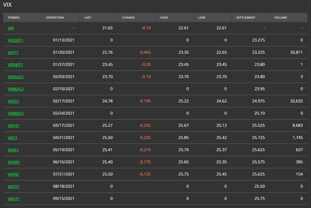 What is so troublesome about VIX futures is the size of the difference between the spot market and VIX contracts. For example, hither is the current VIX market and frontwards curve as provided by CBOE: